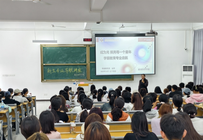 为帮助教育科学学院学前教育专业2025级新生更好地开启专业学习、规划未来发展,2025年10月15日,学前教育专业导航讲座在B201教室顺利举行。本次讲座由学前教育系主任金玲老师主讲,2025级全体新生参加。