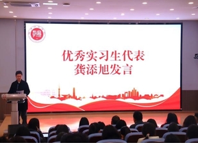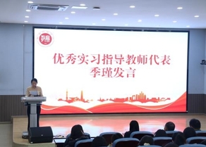 优秀实习指导教师代表季瑾对同学们顺利完成实习表示祝贺,并高度评价了实习生们展现的专业素养与敬业精神。她勉励大家永葆教育初心,以智慧与热忱点亮学生的品德灯塔、夯实知识根基,并祝愿同学们在未来教育生涯中乘风破浪,满载而归。优秀实习生代表龚添旭同学深情回顾了从初登讲台的忐忑到逐渐从容的成长历程。他分享了自己在观察学习、因材施教以及临危受命担任代理班主任过程中的实践与体悟,感慨“好的教育从来不是千篇一律的模板,而是看见每个孩子的不同”,并真切体会到教育是一场“温暖的双向奔赴”。他的发言充满热爱与信念,引发了全场共鸣。