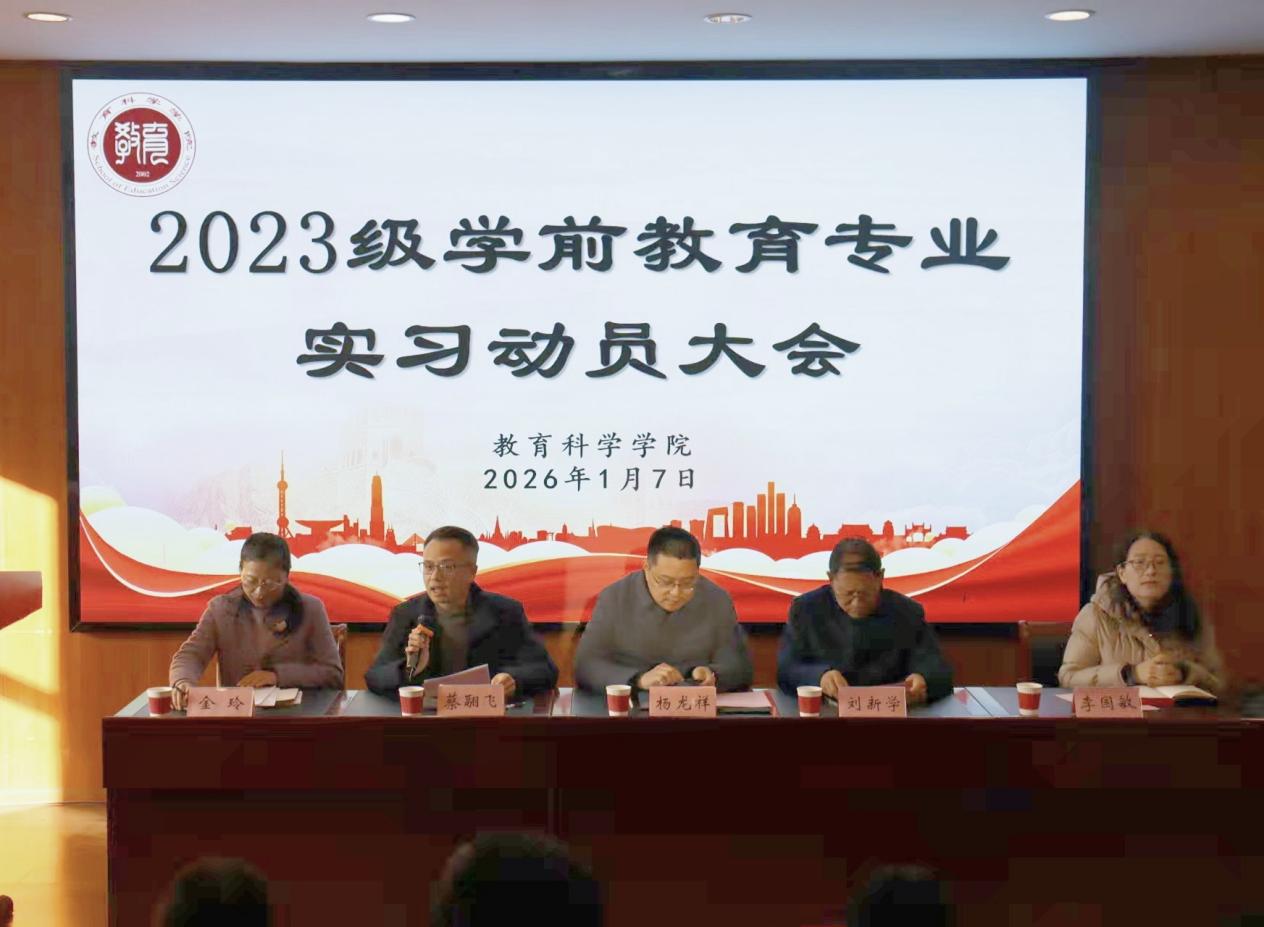 2026年1月7日下午,教育科学学院2023级学前教育专业实习动员大会在博韵楼114室召开。教育科学学院党总支书记杨龙祥、院长刘新学、副院长蔡翮飞、党总支副书记李国敏,以及全体实习指导教师和2023级学前教育专业全体学生参加了会议。会议由学院副院长蔡翮飞主持。